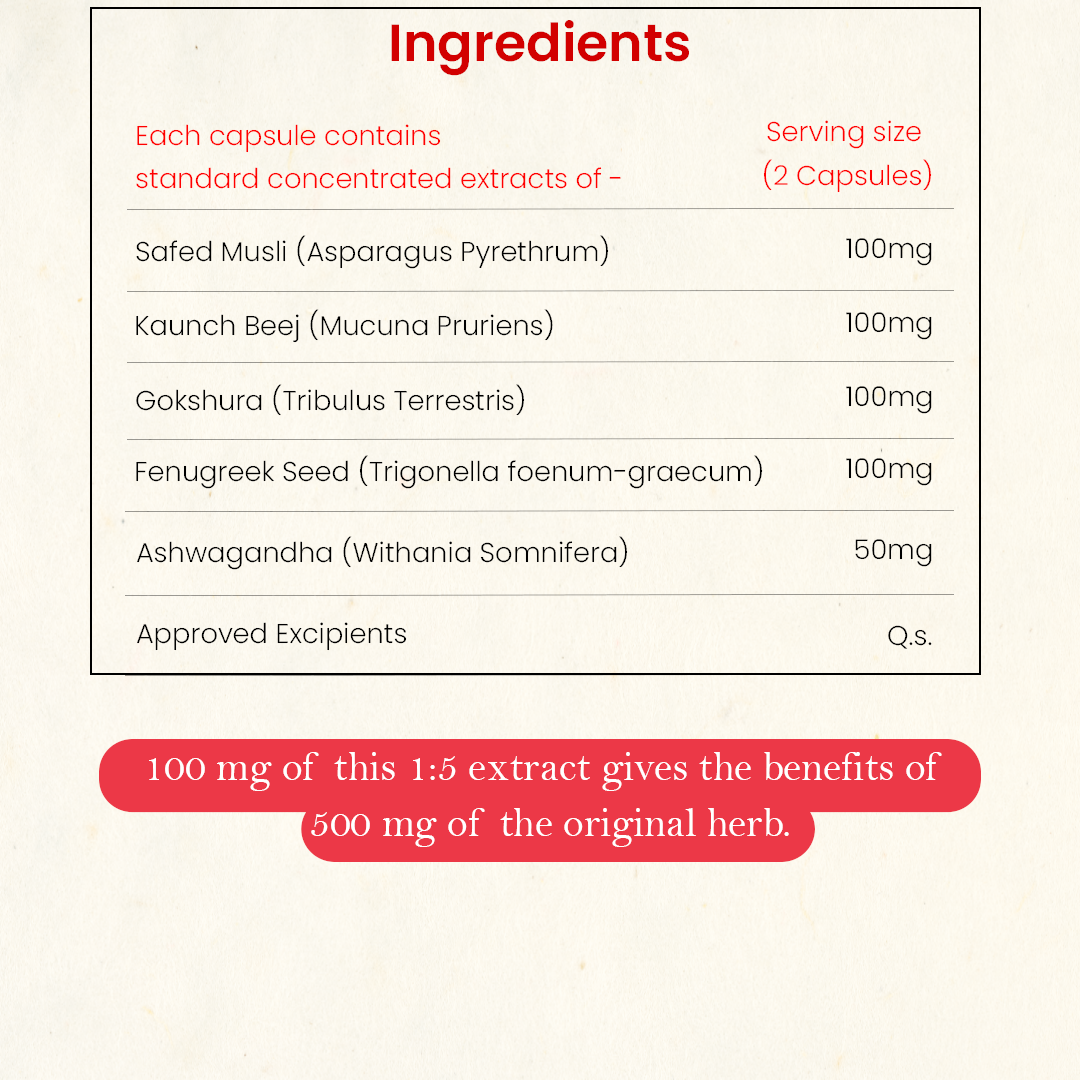 Made with Ayurvedic herbs like Safed Musli, Ashwagandha, Gokshura, and Kaunch Beej, it supports sexual desire, hormonal balance, and overall vitality — without any side effects.