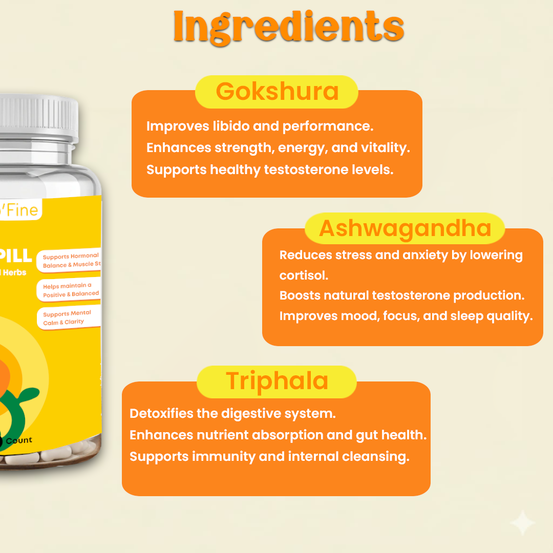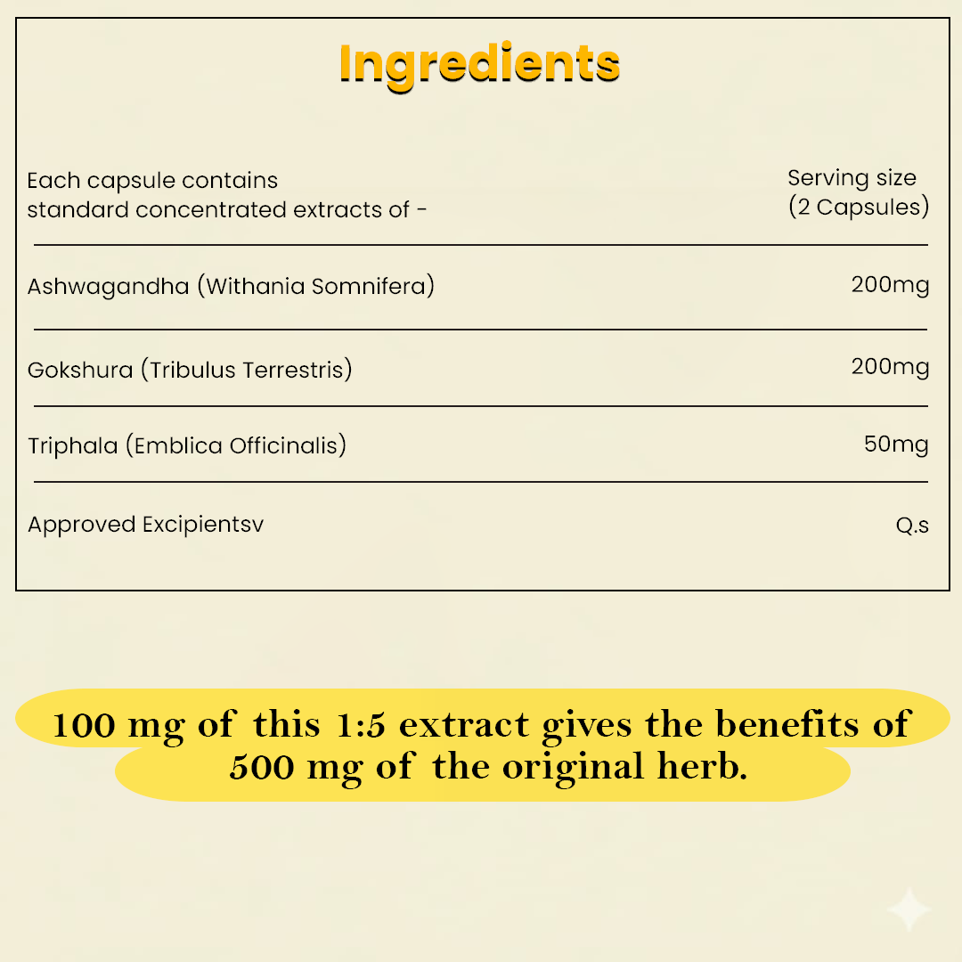 Formulated with powerful Ayurvedic herbs like Ashwagandha, Gokshura, and a touch of Triphala, this natural blend helps you handle stress, improve focus, lift your mood, support testosterone levels, and even improve digestion and appetite — all without any side effects.